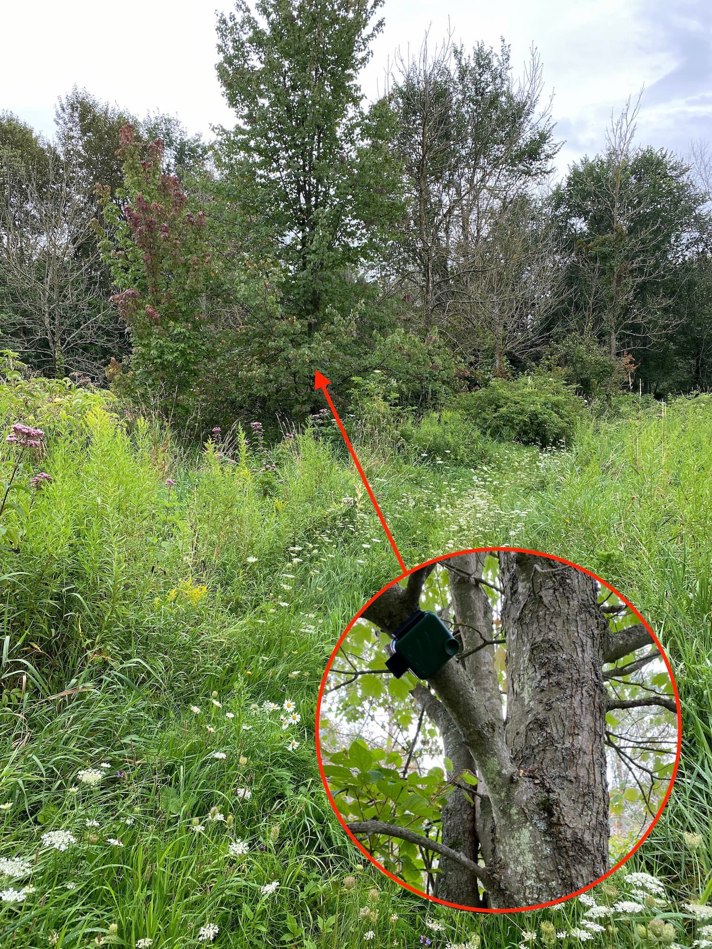 Yesterday I went to collect my data. However, when I got there, the AudioMoth was gone! Something (raccoon, likely) had undone the velcro strap and it was laying in the long grass beneath the tree. I'm going to need a better mounting option!