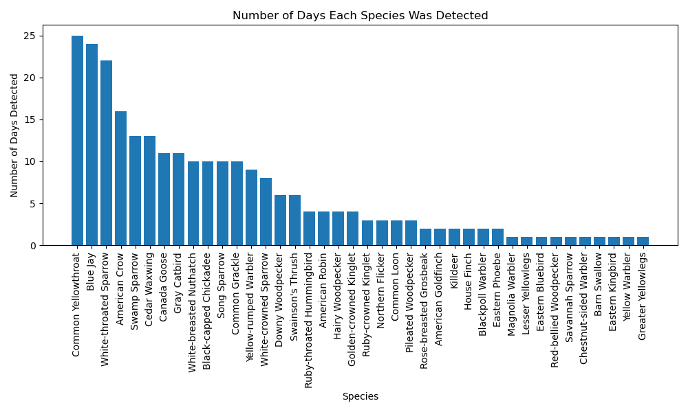 Here's a graph of all the species and how many days each one was detected, giving a sense of frequency across the month. I was surprised that the Yellowthroats were the most numerous.