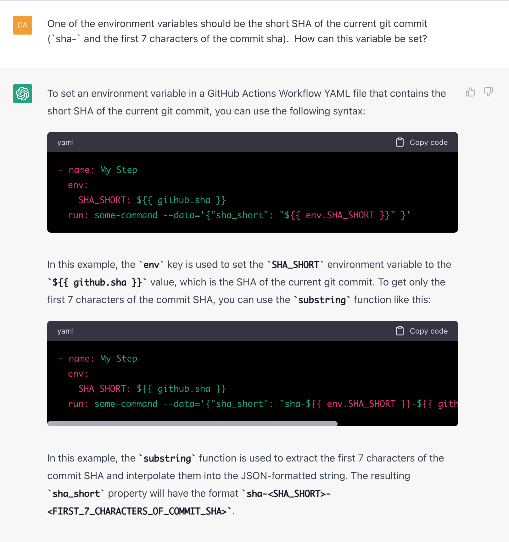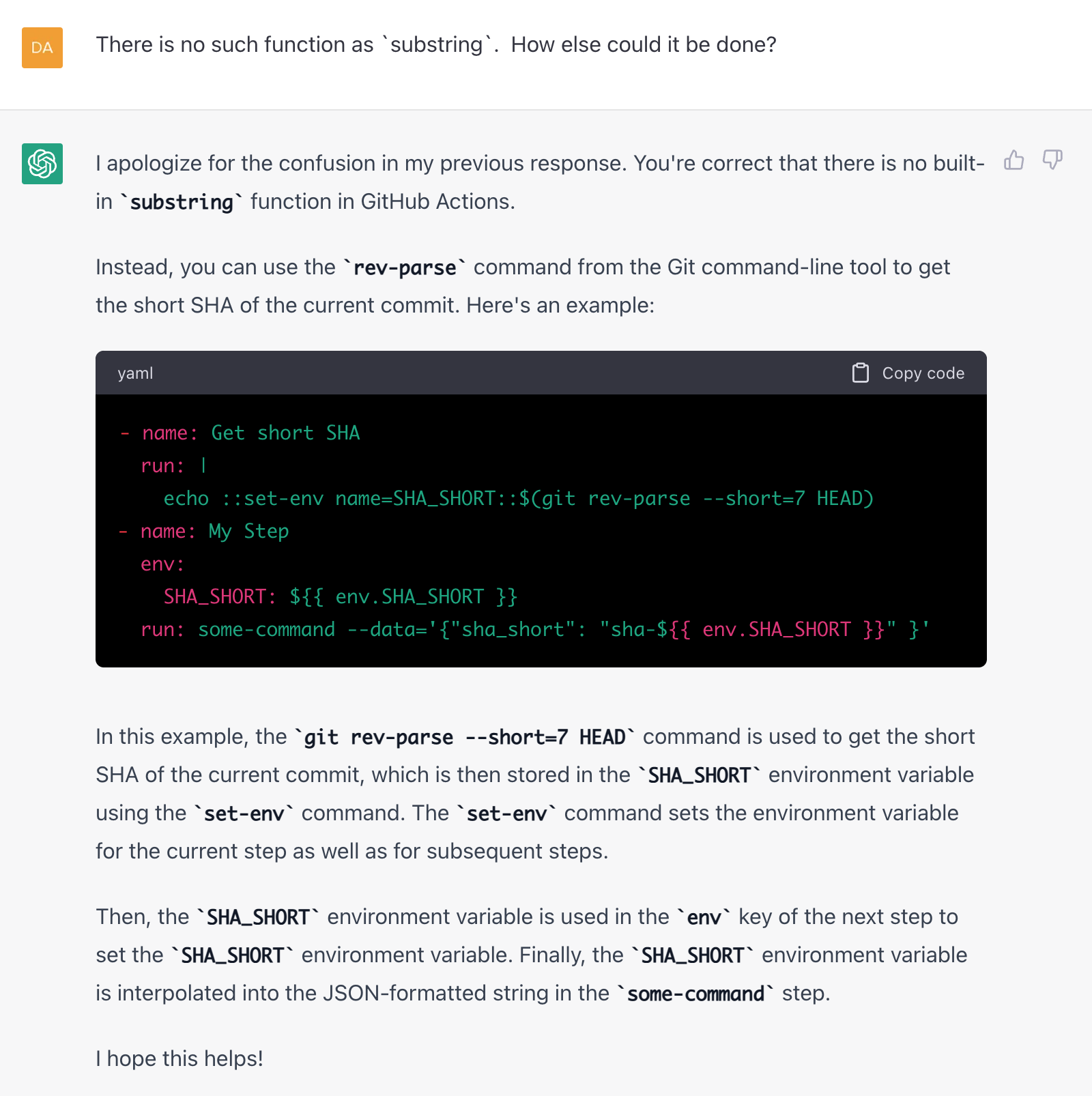 Later in the week I used ChatGPT to solve a real problem I had. I was struggling to write some GitHub Actions code for a Docker build and webhook deployment flow. GitHub Actions are annoying to test, because you have to do it for real vs. running things locally. I couldn't figure out or remember how to do the following:
