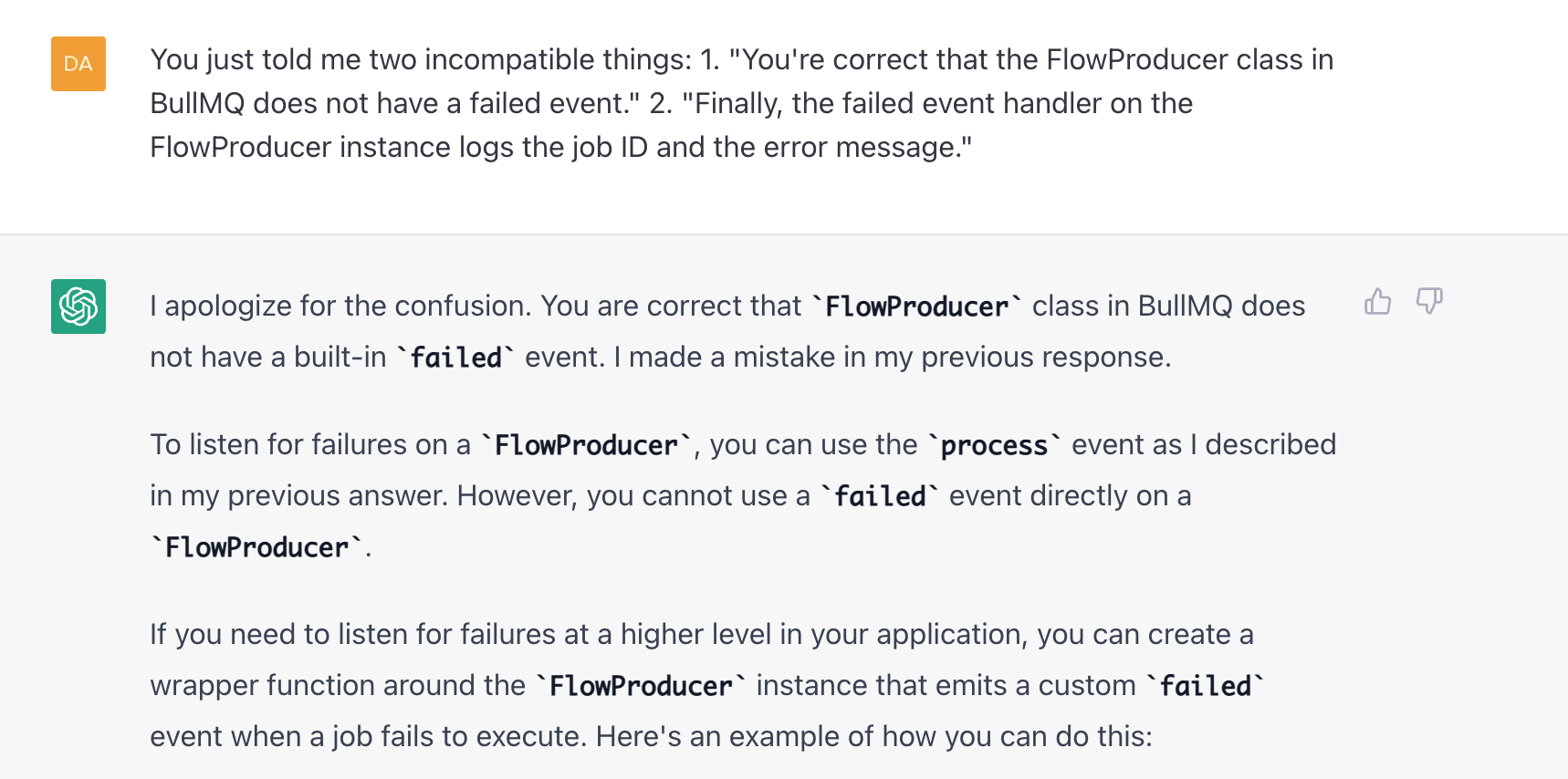 I was pleased to discover that simply mentioning the name of the library, BullMQ, was enough and it knew what I was talking about. However, once again, I had to be patient to arrive at my desired destination. I went back and forth with it many times before I could get it to stop hallucinating imaginary APIs and had to explicitly call out its inconsistency: