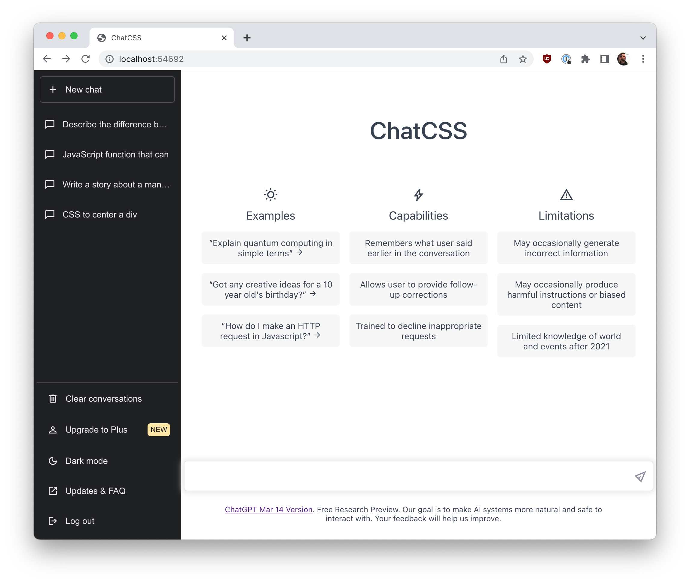 I started the challenge by building ChatGPT in CSS for my second-semester web programming class. We were studying CSS Layout, and the ChatGPT site is a fairly simple one to create, using the topics for the week:
