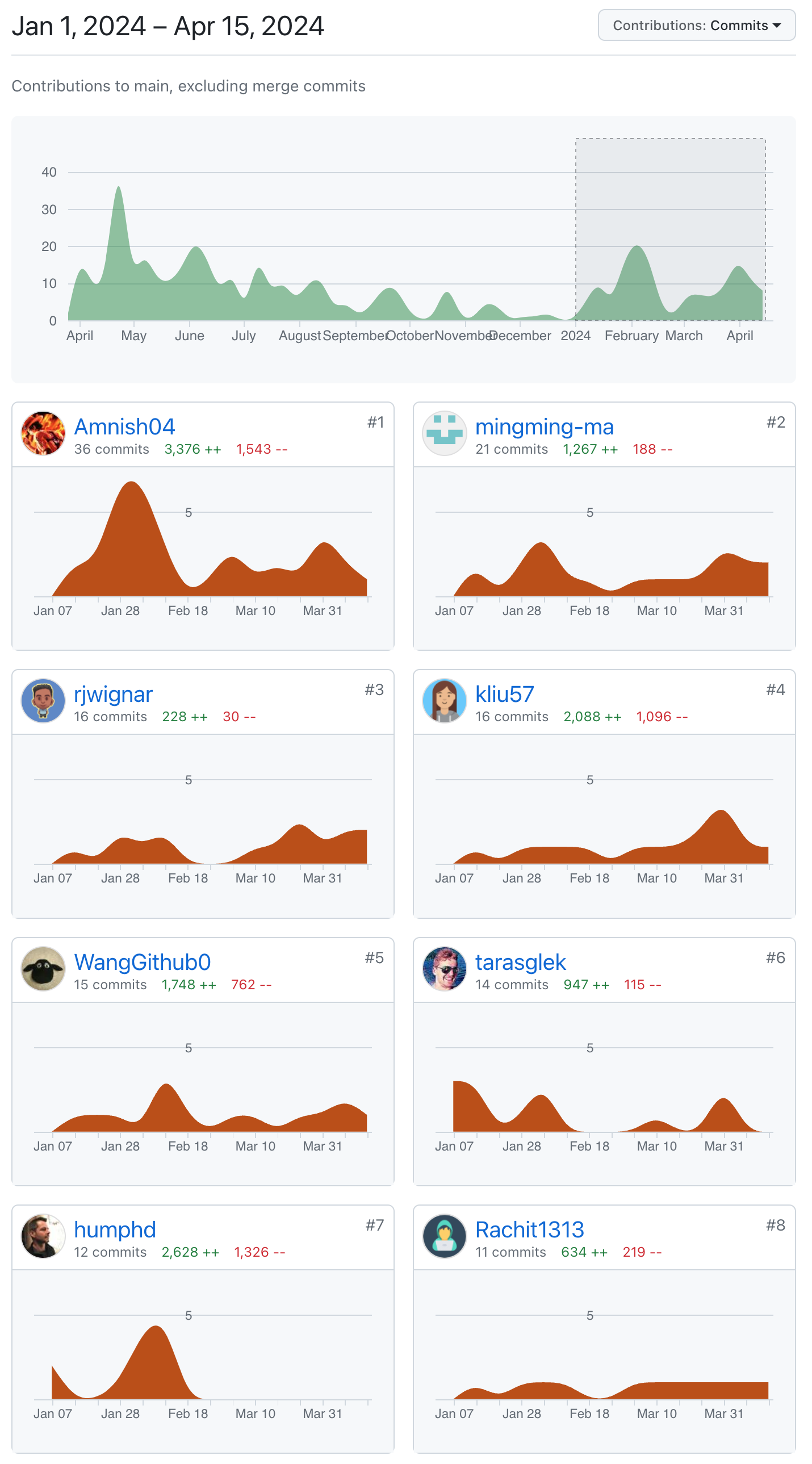 This growth was made possible because of the energy that the students have poured into the project. New features take weeks to plan, implement, and then find and fix the bugs. You need significant mass to create a centre of gravity capable of drawing in new people, and the GitHub contribution graph for the winter term shows how much the students did: