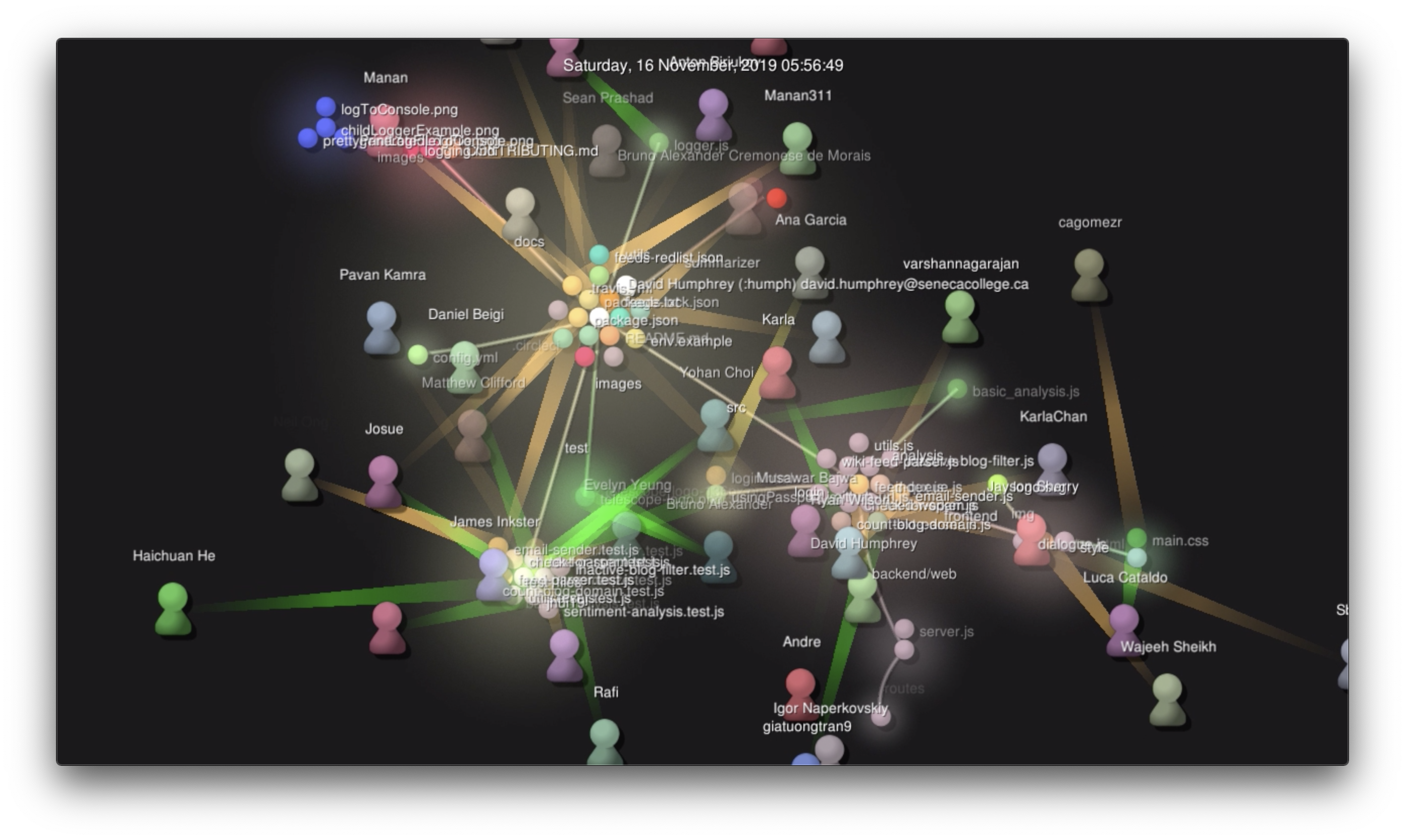 Our project was an RSS/Atom blog aggregator service and frontend called Telescope. The 60 of us wrote it in a month, and I'm pleased to say that "it works!" (though it doesn't "Just Work" yet). I recorded a visualization of the development process and put it on YouTube.