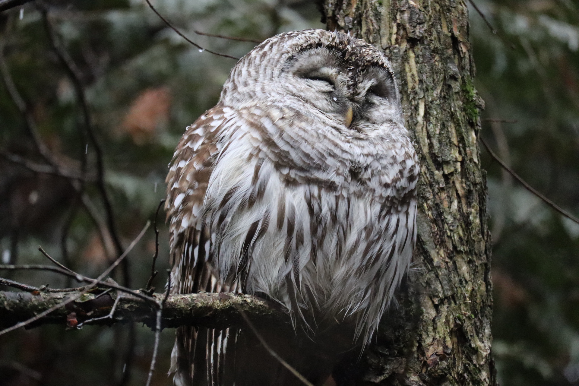 Until then, please enjoy this amazing photo of a Barred Owl sleeping in the woods that my daughter took over the holidays: