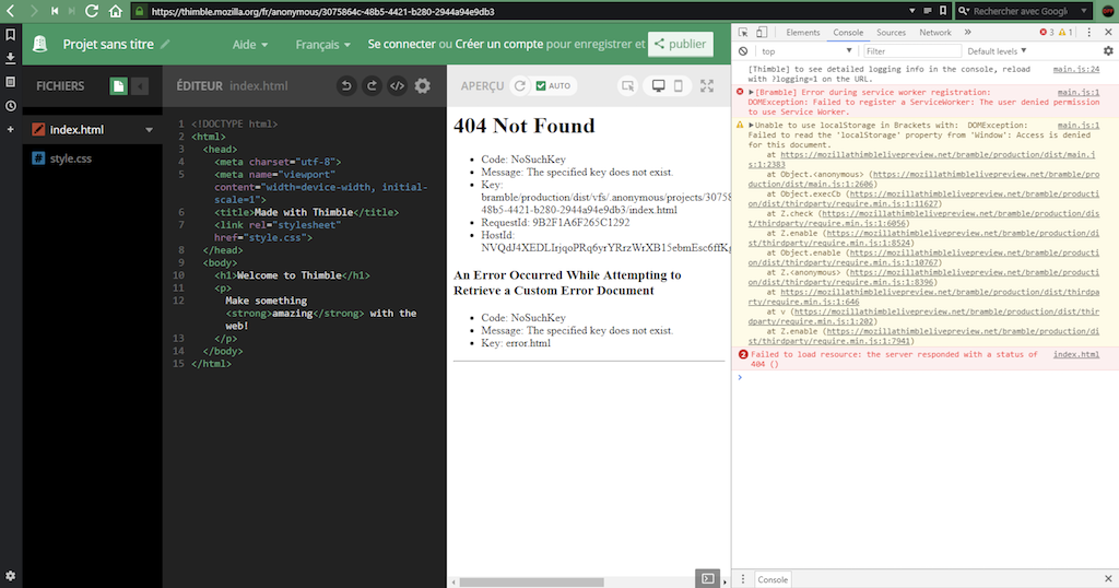 We've been getting reports from some users lately that Thimble has been doing odd things in some cases. One of thing things we do with a Service Worker is to simulate a web server, and load web resources out of the browser filesystem and/or editor. Instead of seeing their pages in the preview window, they instead get an odd 404 that looks like it comes from S3.
