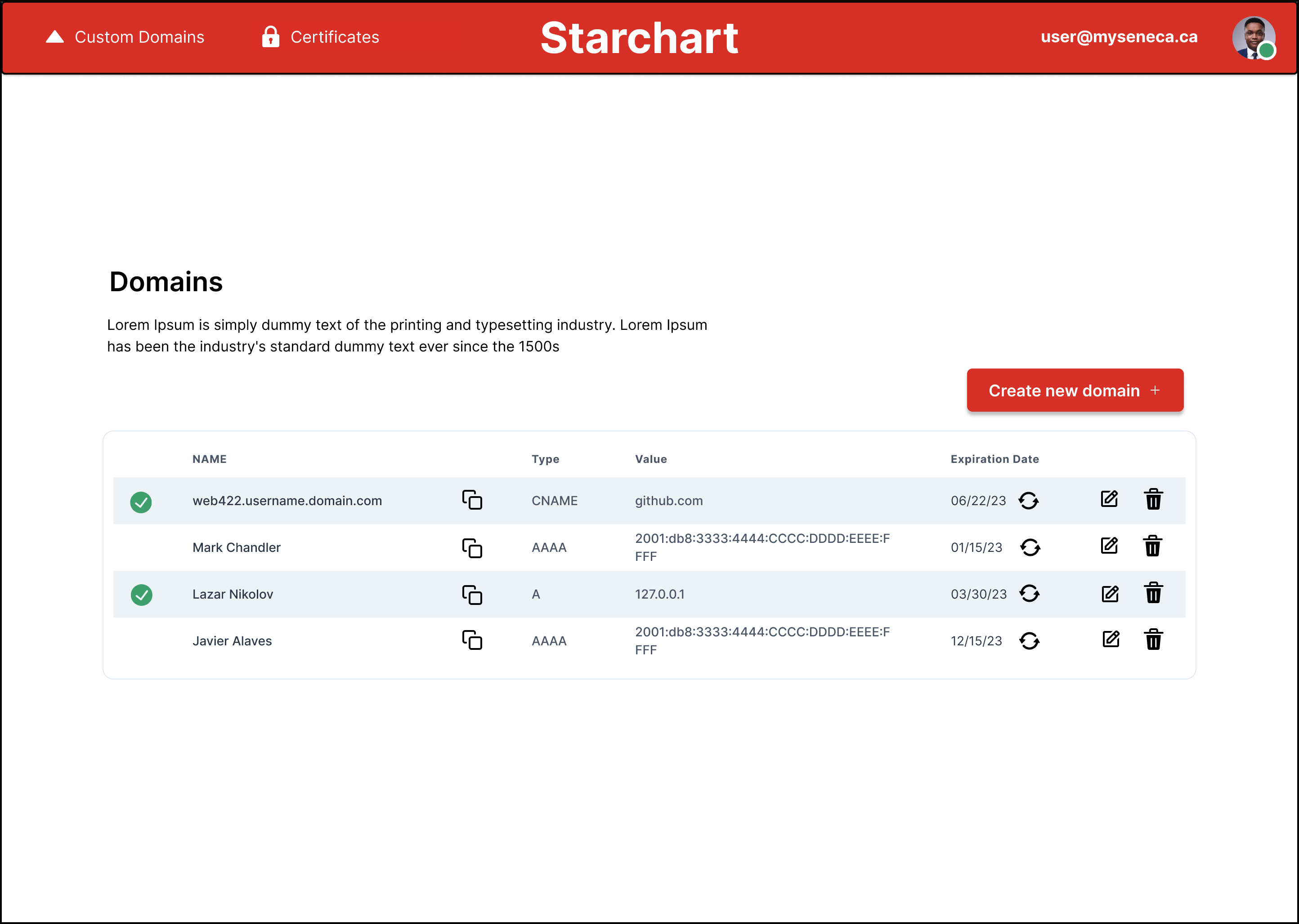 Later today we're going to be shipping our first release of Starchart, our custom-domain and certificate web app for the Seneca community. I was telling my boss about it this week, and she was interested to hear that our students are building all this. I wanted to talk about what it includes and how we built it.