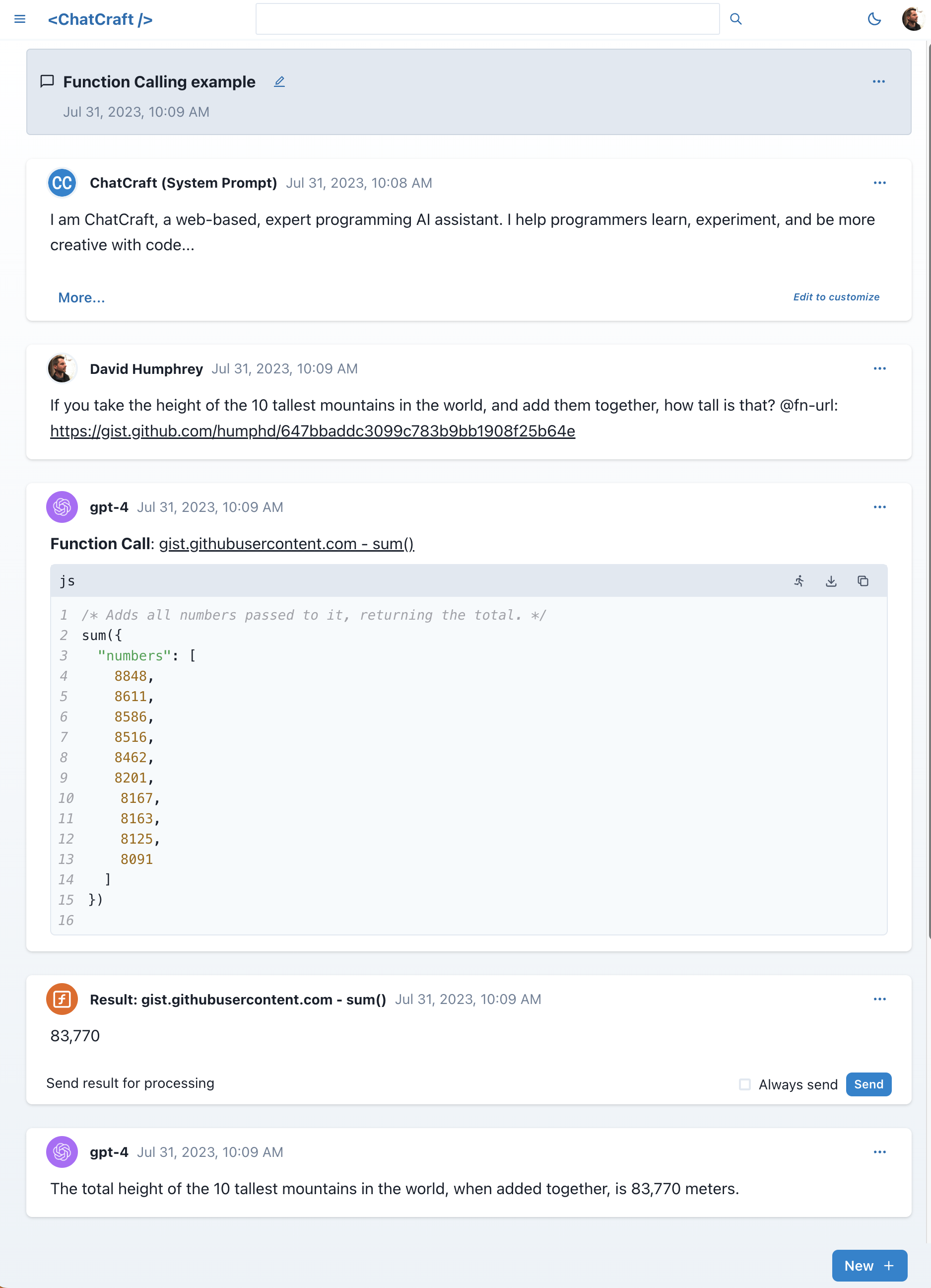 You tell the LLM about these functions using the syntax @fn: sum or @fn-url: https://gist.github.com/humphd/647bbaddc3099c783b9bb1908f25b64e, where @fn refers to the name of a function stored in your local ChatCraft database, and @fn-url points to a remotely stored function.